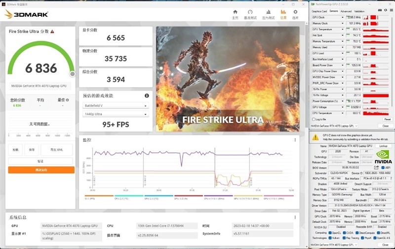 在4K分辨率3DMark Fire Strike Ultra测试中,RTX 4070 Laptop图形分数达到了6565分,核心温度最高65℃,核心运行最高频率为2295Hz,最高功耗106W。