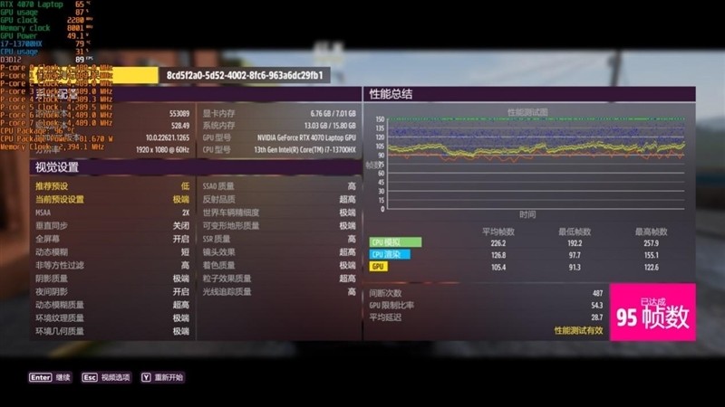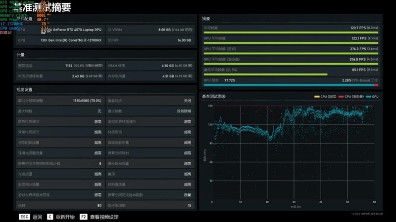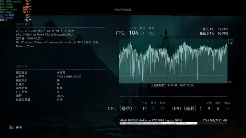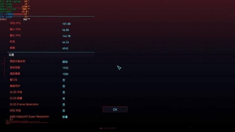 最高画质下,RTX 4070 Laptop帧率是105FPS。