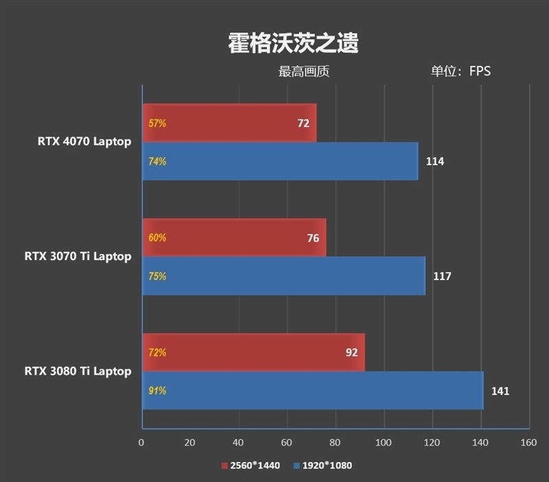 在1080P分辨率下,RTX 4070 Laptop仅在《霍格沃茨之遗》中落后于RTX 3070 Ti Laptop,其他12款游戏中都不同幅度地强于后者,平均领先优势约为9%。