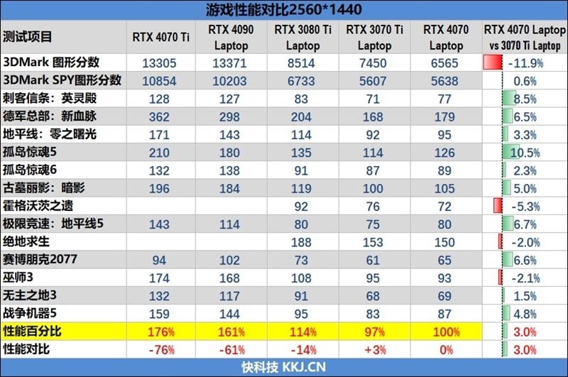 到了2K分辨率下,RTX 4070 Laptop的领先优势有所缩窄,13款游戏平均下来能够领先RTX 3070 Ti Laptop约3%的样子。