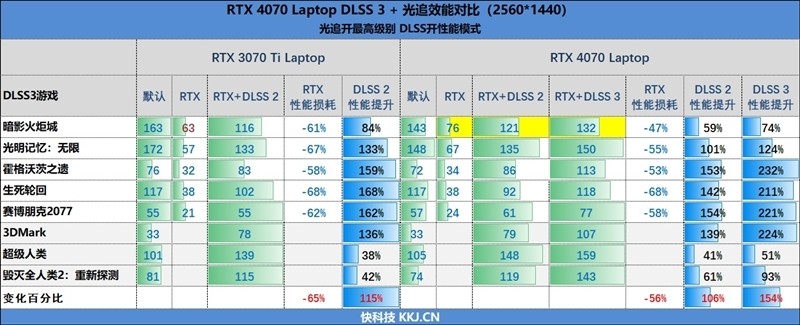 这意味着开启DLSS 3之后,RTX 4070 Laptop的性能表现已经大幅度超越了RTX 3080 Ti DLSS 2。