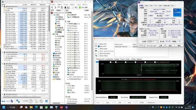 使用AIDA64 FPU烤机,测试时风扇转速拉满,在前面90秒,i7-13700HX的功耗保持在148W,此后会降到107W,并一直稳定在这附近,P核全核频率3.6GHz,温度97度。
