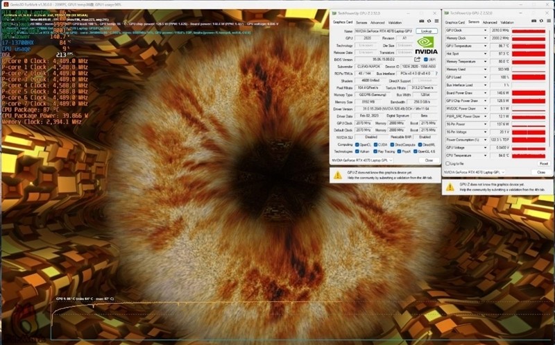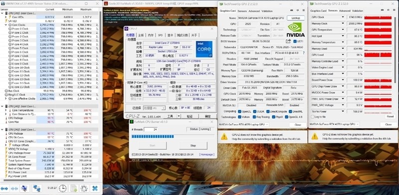 原本想将RTX 4070 Laptop功耗锁定在50W,测试它在这个功耗下的性能表现,但没想到的是,我们尝试了多个工具软件,都只能短暂维持50W,唯一能够稳定50W功耗的游戏是《巫师3》,另外在Furmark也能保持50W功耗进行烤机。