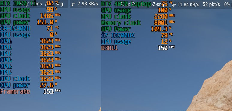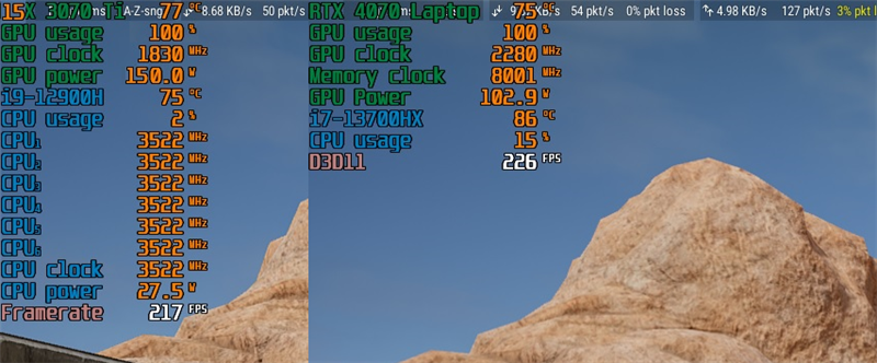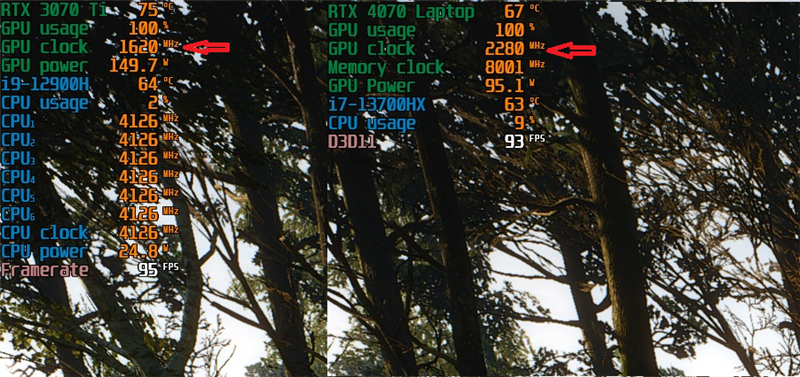 RTX 4070 Laptop在实际游戏中能够稳定在2280MHz频率上,相比之下RTX 3070 Ti Laptop连1600MHz的运行频率都难以保证。