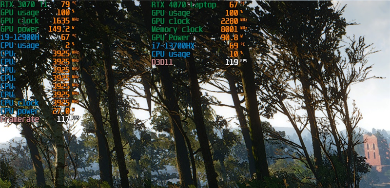锁定在50W功耗时,《巫师3》的帧率为94FPS,而在满血95W功耗时,其帧率为119FPS。可以看出在50W功耗下,RTX 4070 Laptop能够发挥出将近80%的性能,这个性能与RTX 3070 Laptop相去不远。