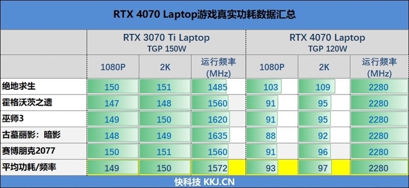 而RTX 4070 Laptop只有95W,足足低了53W,但却运行在最高频率上,也就是2280MHz。