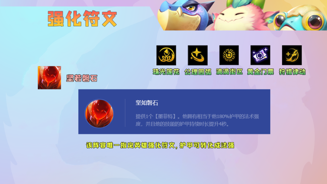 该强化符文会根据墨菲特的护甲来增加法强,经过装备和护卫羁绊的护甲加成会增加数百法强,一个技能拍下去可谓是天崩地裂,直接瞬秒对方前排。