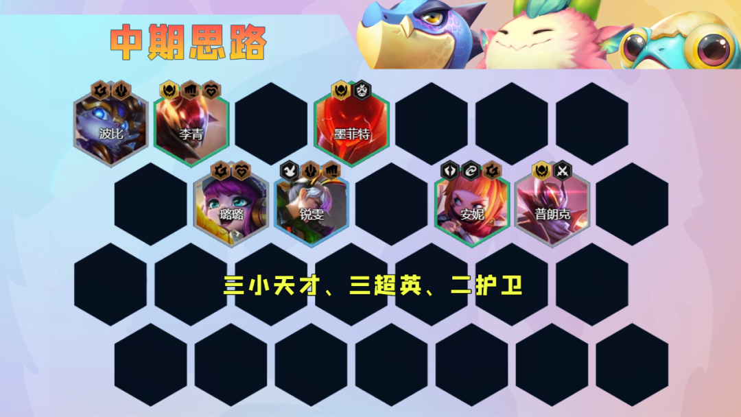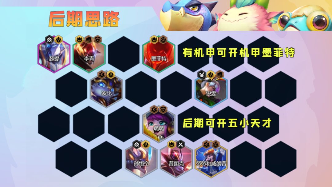 该阵容七级就可以成型,后续可以根据自身条件和对方阵容来转变自身阵容,有机会八级出努努或升九级搜出的话后期开出五小天才,如果有机甲可以玩机甲墨菲特,如果敌方魔法伤害就把护卫换成秘术。