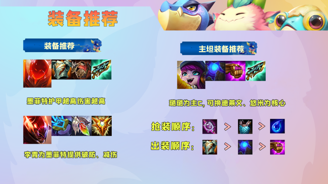 璐璐作为该阵容的副C,蓝BUFF、珠光护手、科技枪是最优三件套,如果没刷到墨菲特的强化符文时璐璐就会作为主C挺身而出。(如果璐璐的牌不胡的话可以用悠米替代)