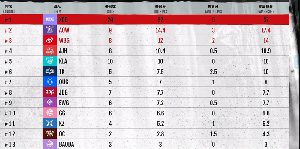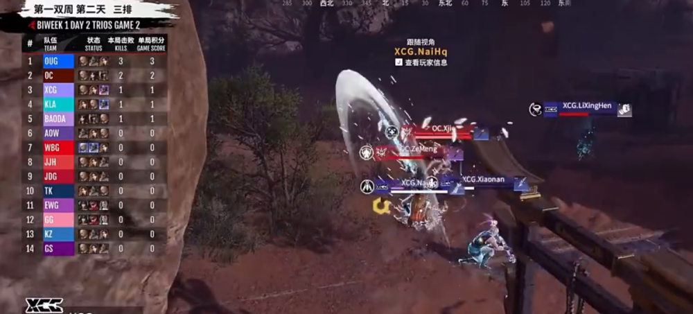 决赛圈中,XCG战队状态十分不错,先是干脆利落的解决掉了OC战队的残余选手,之后AOW战队的队员直接从墙头一跃而下,平台率先落地被对方直接抓到破绽给击倒,接下来AOW的平头大佛奥义开启,XCG也后续跟着开启,两个大佛展开了肉搏,在双方的火力集火下,平台被对方先秒,AOW战队这边想击杀对方的小南,不料小南落地直接变机甲,完美的进场配合队友击杀AOW剩下的2名选手。可惜了,AOW战队3名选手似乎临场发挥还有所欠佳被XCG夺走了天选!