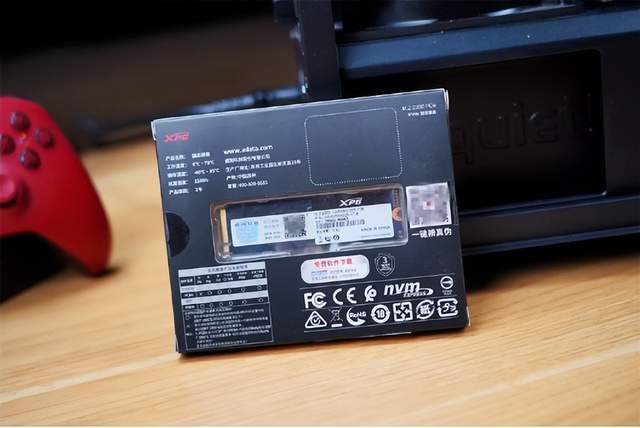 这款黑色款包装正面可以看到XPG的logo,以及LDPC校验技术认证标志,当然还有非常性感的电竞姬,黑色包装也意味着这款硬盘支持3年质保,用户可以放心的使用。