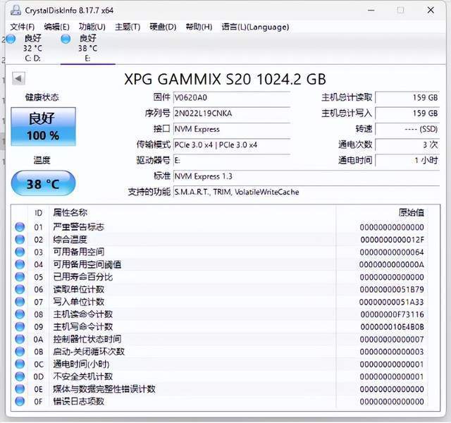 XPG翼龙S20固态硬盘的固件型号为V0620A0,采用PCIe3.0x4传输模式。待机温度38℃,当然这是使用散热装甲后的效果,单盘会高一些。哈哈!