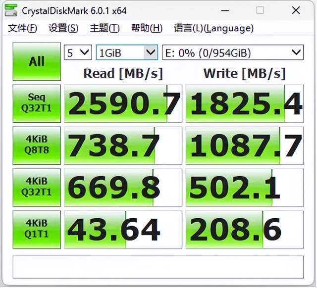 CrystalDiskMark测试中,持续读写速度分别达到了2590MB/s和1825MB/s,4K随机读写为43MB/s和208MB/s,这个速度要比官方给出的数据出色一些。