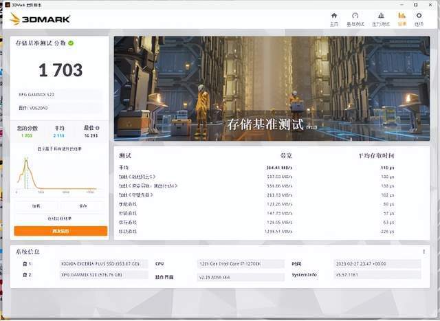 3DMark存储基准测试涵盖了战地5、使命召唤15:黑色行动4、守望先锋三款游戏的启动加载过程、录制游戏视频、安装游戏、保存游戏、全球攻势从移动硬盘拷贝到系统盘的过程等等,可以说涵盖了PC游戏玩家所能遇到的方方面面。存储基准测试最终得了1703分,存储带宽304.41MB/s,相对于这个价格来说,这样的表现也算不错了。