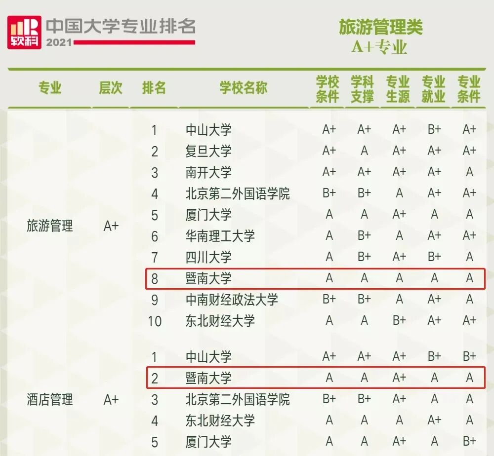 2020和2021年,在高等教育评价机构软科发布的“软科世界一流学科排名”中,暨南大学“旅游休闲管理”学科连续两年跻身全国前6,全球第51-100名。在“2021软科中国大学专业排名”中,暨南大学旅游管理专业和酒店管理专业喜获双A+,且在内地仅有的5家双A+高校中唯一获得细目类全A。