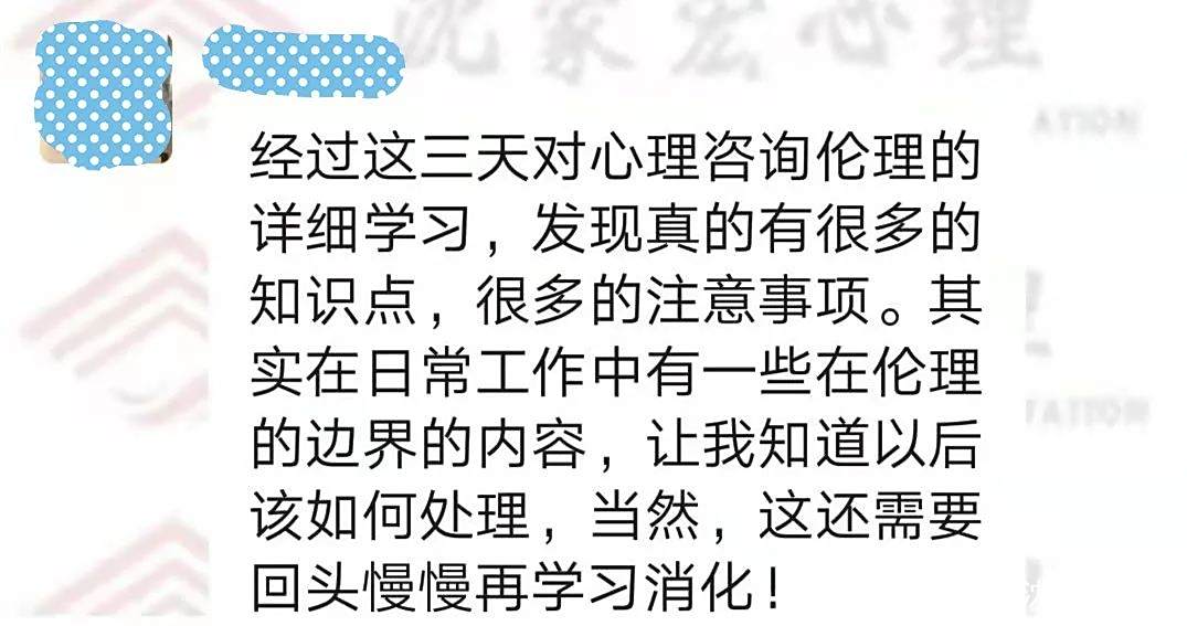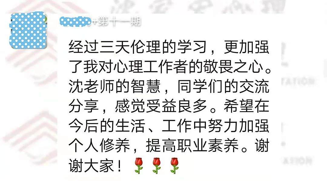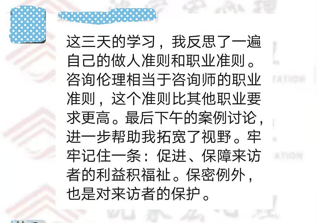 三天的伦理课程,沈家宏老师分别从伦理相关知识、心理咨询相关伦理、婚姻与家庭治疗伦理、相关法律规定等几个方面给大家进行培训。