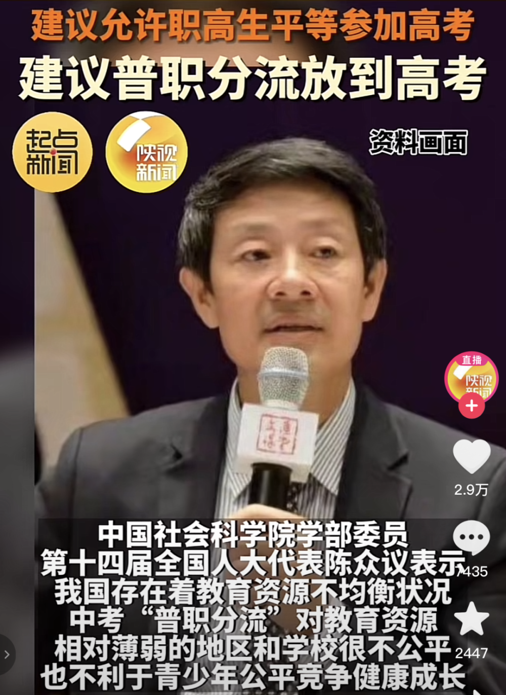 近日,中国社会科学院学部委员、第十四届全国人大代表陈众议表示,本次两会,他就试行十二年义务教育,中考普职分流延迟到高考一事,递交建议。