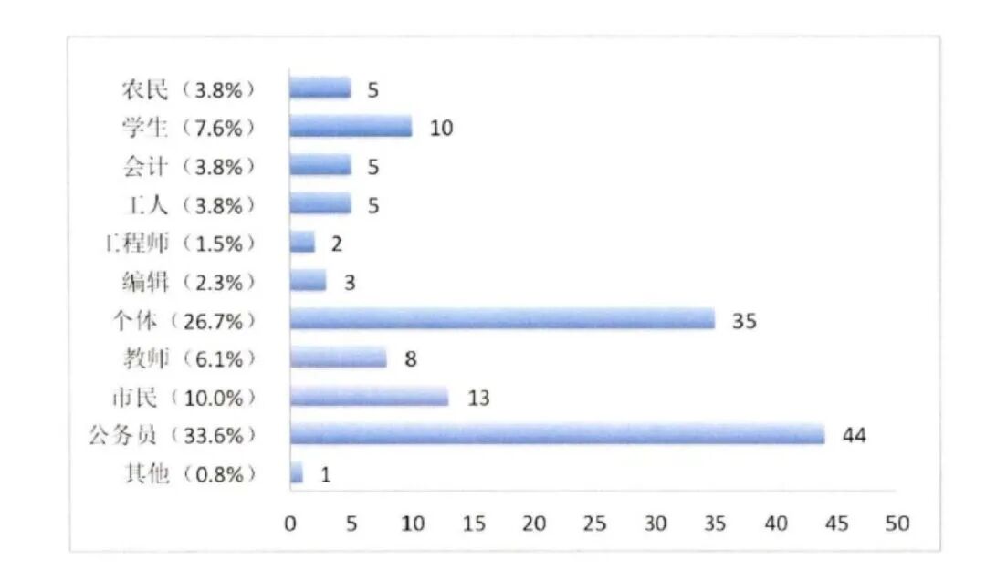 或许正是因为医院的特殊性,来八大处整形外科医院做处女膜修复手术的患者统计信息有些出人意料。一篇北京协和医学院博士生学位论文统计调查了在这家医院接受处女膜修复手术患者的职业(见下图)。