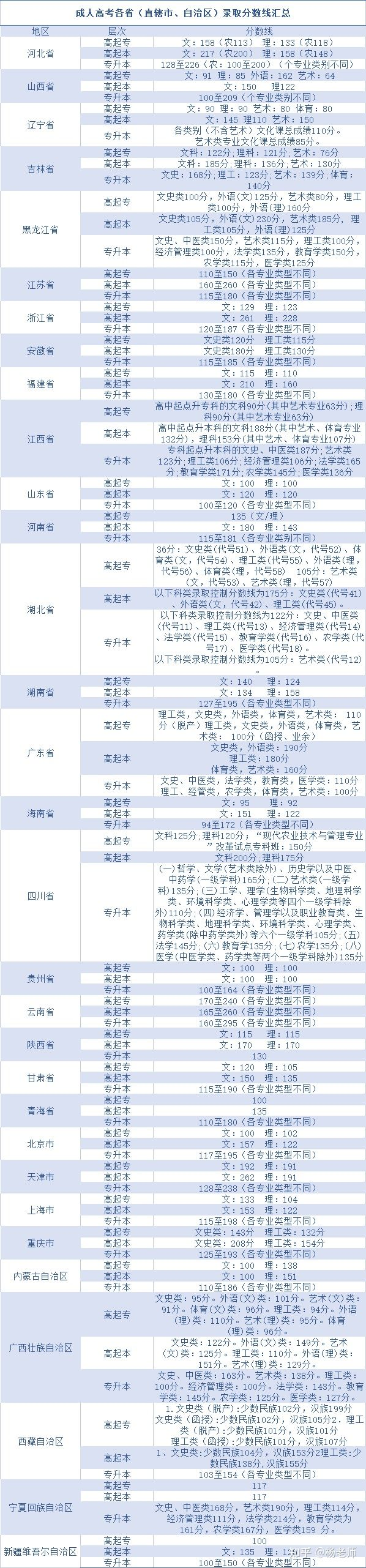 其他省份考试科目也是一样的成人高考和自考不同,成人高考考过后各省教育考试院会公布当年的录取分数线,只有过线的考生才有机会被录取,每个省份的录取分数线不同:
