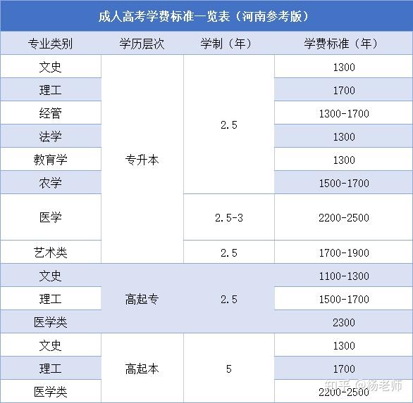 成人高考和自考不同,自考是自学,是没有官方学费的,你自己报班就掏报班的钱,自己买资料就掏资料钱,但是成人高考学费是学校收取,因为成人高考考过之后是被学校录取入学,属于学校的一名学员,享受学校的教育资源,所以需要交学费,不过学费并不贵,河南省是收费比较低的一个省份下面给大家展示一下收费标准,其他省份可以参考: