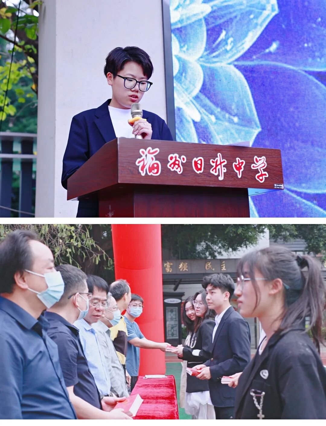 高三学生代表林诗语上台分享了她的人生感悟,随后,学生代表们接过校领导手中的《宪法》,同学们以鞠躬的形式行感恩礼。