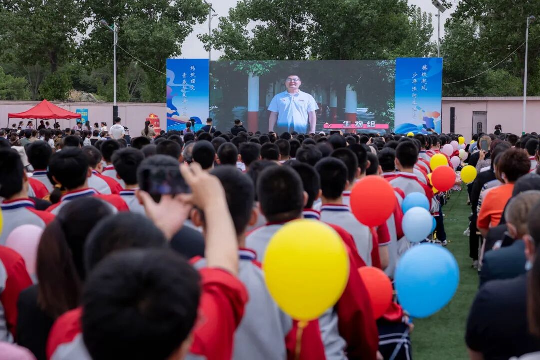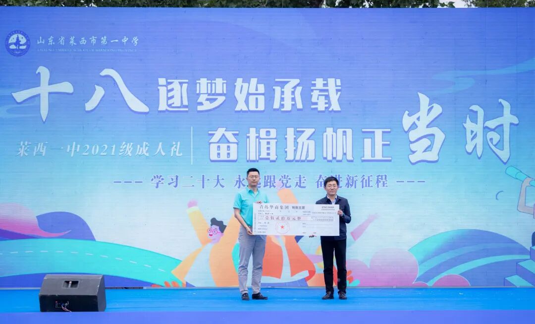 青岛华商集团公司董事长赵德欣带着满满的诚意捐赠母校、感恩母校、回报母校,并祝福全体高二学生走进成人世界,走向更加广阔的未来,同时鼓励同学们在新的人生阶段时刻牢记成长责任和青春使命,把党和国家放在心中最高位置,在实现民族复兴中国梦的征程中绽放夺目光彩。