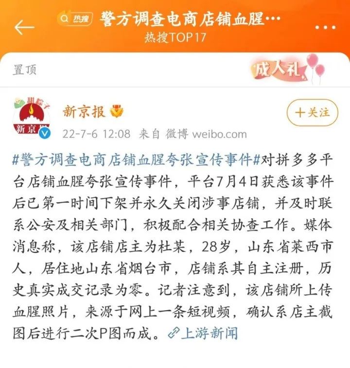 △“胖屠主”发布的招募信息 | 图源:网络如果不是刺眼的“畜”“猪”“屠夫”,都让人几乎要以为这是在招聘或征婚。一想到这些账号后都是活人,我就怒从心头起。正当人们深陷恐惧之中时,平台以“商家炒作、夸张宣传”为由,回应了网友的争议。图片是P的,店铺历史成交记录为零,后续措施是永久关闭店铺、公安介入调查。