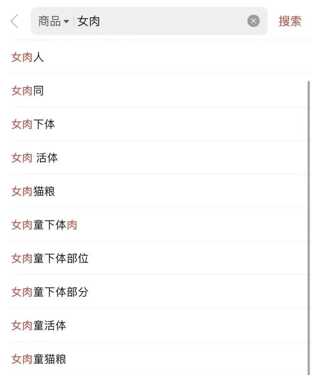 △有网友尝试下单 | 图源:网络不少人赞同,认为这是种交易黑话。但如果真的是这样,商家又为何要配上小女孩碎腿的照片呢?于是,有了第二种更直接的猜想:也许卖的不是色情服务,而是真的人肉。在平台搜索“女肉”,会出现一系列类似词条: