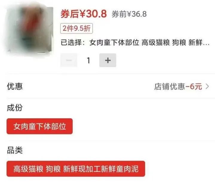 1被售卖的“女童肉”在该平台的某“高级猫粮狗粮”的商品页面,详情图用的是一张小女孩的生活照。女孩看起来不过六七岁,腿部的位置,ps成了一截断开的血肉。商品成分则是“女肉童下体部位”,品类为“新鲜童肉泥”。