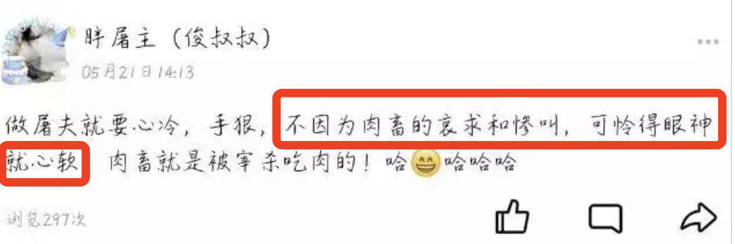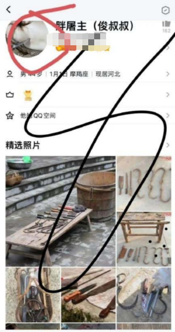 △某社交平台的聊天群 | 图源:网络他以“行内人”的身份潜了进去,发现群里的成员多达上百位。他们自称为“屠夫”,在群里肆意交流着宰杀的经验。而一条条鲜活的生命,在他们口中则是“肉畜”。自称“胖屠主”的群主,相册里满是不同大小工具的照片。工具上还隐约残留着暗红色的痕迹,不知是铁锈,还是干涸的血迹。