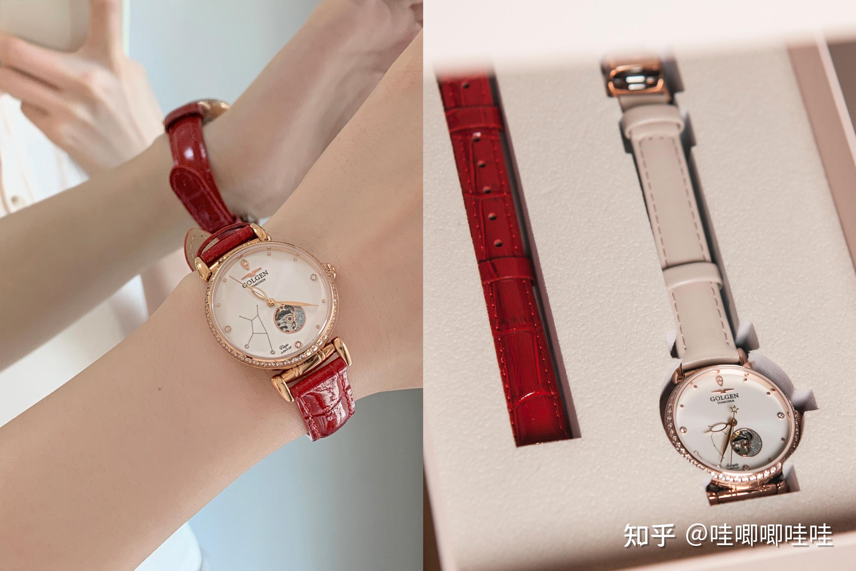 品质也十分在线,到手就是精美大牌的质感,小牛皮幸运红的表带搭配大小适中的香槟金表框,十分的显白有气质。表圈镶嵌52颗锆石BLINGBLING特别好看,52颗也有着我爱你的寓意,一整个心意度拉满!