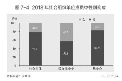 从职业的层级结构看,男女都是以工农业生产劳动者为底部的金字塔结构。在金字塔尖职业声望最高、具有权力资源的单位负责人中,2017年男性比例是女性的2.2倍,虽然相比2010年、2014年性别比有所下降,但仍是男女职业中差距最大的一类[11]。除了在医疗、教育等专业中女性持有优势外,女性也越来越多地进入以往较难进入的领域,例如全国律师中女性所占比例由2010年的24.1%上升到2017年的33.3%;2017年女性在正副检察长中占比分别为8.6%、13.5%,而女检察员的比例则达到34.0%[12]下图则为2018年社会组织单位成员中性别构成 (资料来源:民政部)[13]