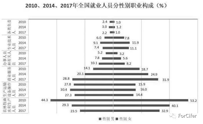 农村特困人员及性别构成(资料来源:民政部)[8]特困人数男性远多于女性。但乐观的是:Goldin认为劳动力市场的变化是实现男女平等的最后一个乐章,同时性别工资差距会逐渐减少并最终消失[9]。劳动力市场情况:妇女的职业结构在近十多年间变化较大。从国家统计局2010、2014、2017三个年份全国就业人员分别职业构成的统计数据(下图)可以看到:在七年中女性从事农林牧渔水利业生产人员的比例降低幅度最大,下降了20.3个百分点,与男性退出这一职业的幅度接近(男性下降了20.8个百分点);最具积极意义的变化是,女性中从事专业技术工作人员的比例从7.8%提高到11.1%,且上升幅度是男性的2.3倍。女性职业结构的优化趋势,得益于女性接受高等教育的比例不断提高,使女性高层次人才呈不断增长趋势。2017年女性在研究和开发机构(R&D)中占到33.4%,特别是在医药科学研究开发人员中,女性占比为53.4%,超过了半数;另从专业技术职称来看,2017年在具有正副高职称的专业技术人员中,女性占到38.3%,中级职称中占48.6%,分别比2011年提高了2.9、2.8个百分点。女性更多进入管理决策层,其影响力在加大。迄今为止,尽管女性群体就业结构仍是一个以蓝领劳动者为主、在经济管理决策层处于边缘位置的结构,但不可否认,近年来女性已加快、加大了进入经济管理决策层的步伐,女性在基层管理中的影响力也在加大。2018年企业董事会中,女职工董事占职工董事的比重为39.9%,企业监事会中女职工监事占职工监事的比重为41.9%,与2010年相比分别提高了7.2和6.7个百分点。1995年,中国女企业家仅占企业家总数的11.4%,到2018年,女性在企业负责人中的占比达到四分之一[10]