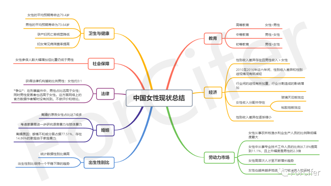 获得法律机构援助的人数及性别构成 (资料来源:司法部)[18]从2003年到2018年,女性获得法律机构援助的人数有了大幅度的增长。在刑事案件中,男性加害者占比远高于女性;同时男性受害者也远高于女性。这方面网络上的官方数据作者暂时没有找到。不做评价和结论。社会保障情况:2018年,全国参加城镇职工基本养老保险、城镇职工基本医疗保险、失业保险、工伤保险和生育保险的女性人数均有大幅增加,但女性参与比重均低于男性,其中女性参与工伤保险的比重最低,仅为39%。通过建立面向城乡居民的基本医疗保险制度,目前覆盖面超过了10亿人口,加上城镇职工基本医疗保险,覆盖率达到了95%以上,已经基本实现了全民医保。在养老保障方面,经过长期努力,基本实现了制度全覆盖。女性享受各种社会保障的程度大幅提高,但在参保人数中的占比低于男性,这与总人口中女性比重较小是相一致的。具体来看,在养老保险方面,2010年至2018年,城镇职工基本养老保险中女性参保人数增长了7465万人,所占比例从43.6%提升至44.6%。2018年,城乡居民基本养老保险中,女性参保人数24244万人,占比46.4%。在医疗保险方面,城镇职工基本医疗保险中女性占比在逐年提高,城乡居民基本医疗保险中女性占比提升尤为突出,2011至2018年,性别构成由34.1%上升至43,8%。在失业保险和生育保险方面,女性占比均达到40%以上,而工伤保险方面虽然占比较低,2018年仅为39%,但相比2010年35.3%的占比仍实现了较大的增长。此外,我国城乡最低生活保障水平持续提高。2018年,全国城镇享有“低保”的居民1007万人,女性与男性分别占44.8%和55.2%;农村享有“低保”的居民有3519万人,女性与男性分别占42%和58%。在城乡低保中女性所占比重均低于男性[19]。卫生健康情况:中国人口平均预期寿命持续延长,2015年我国人口的平均预期寿命为76.3岁,其中女性的平均预期寿命达79.4岁,比1990年延长了近9岁[20],男性则为73.64岁。同时,孕产妇死亡率明显降低。2018年孕产妇死亡率由1990年的88.8/10万降至18.3/10万,下降了79.4%。2018年,妇女常见病筛查率75.5%,比2010年提高了14.3个百分点。看完这么多,我做了个初步结论。在性别相对平等判断和比较中作者不支持看综合得分和排名,因为改变加权方法、引用另一组数据就可能会得到完全不同的分析。只有看某个具体小项,才能做出更有意义的分析和结论。如果具体项有疑问的朋友可以自行查询具体项相对应的参考资料并深入分析。看思维导图时建议逆时针,从右上开始看。