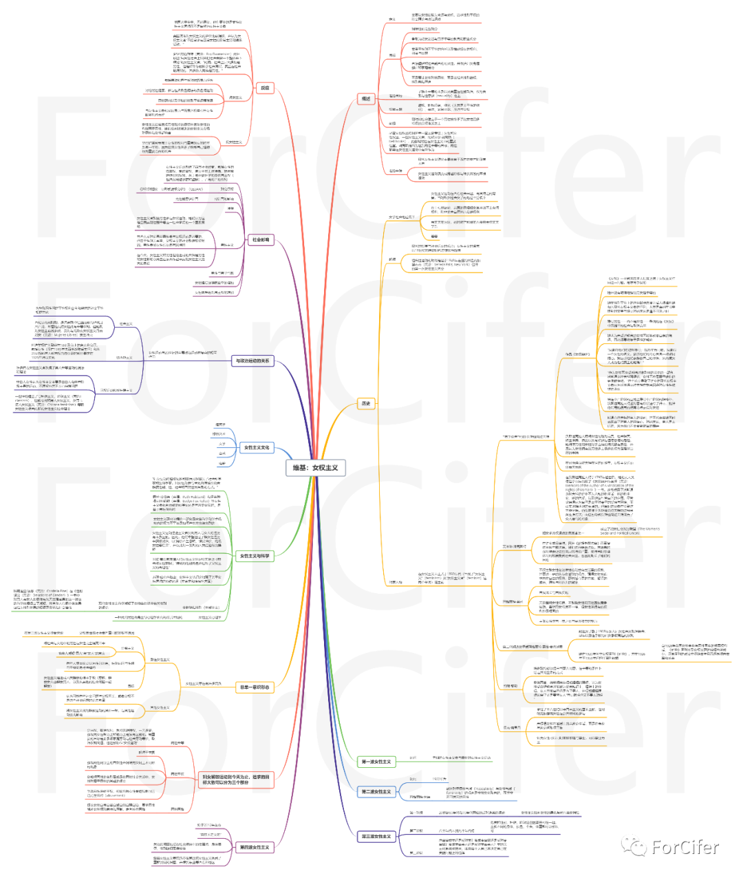 在讲述女权发展史中,作者查阅了大量文献。将分几个定义系讲述。百度、大陆维基百科、英文维基百科、知网(系指的是分支);知网系将在4妇女、女性、女子5女权主义、女性主义、妇女解放运动中解释首先是百度定义女权系。百度定义:女权主义(Feminism)又称女权、女性主义,是指为结束性别主义(sexism)、性剥削(sexual exploitation)、性歧视和性压迫(sexual oppression),促进性阶层平等而创立和发起的社会理论与政治运动,在对社会关系进行批判之外也着重于性别不平等的分析以及推动性底层的权利、利益与议题。女权主义与女性主义是同一个英语单词“feminism”在中文的两种译法,两者本质没有区别。女权主义认为现时的社会建立于以男性为中心的父权体系之上。女权主义理论的目的在于了解不平等的本质以及着重在性政治、权力关系与性意识之上。女权主义政治行动则挑战诸如生育权、堕胎权、教育权、家庭暴力、产假、薪资平等、投票权、代表权、性骚扰、性别歧视与性暴力等等的议题。女权主义探究的主题则包括歧视、刻板印象、物化(尤其是关于性的物化)、身体、压迫与父权。女权主义运动是一个跨越阶级与种族界线的社会运动。每个文化下面的女权主义运动各有其独特性,并且会针对该社会的女性来提出议题,比如苏丹的女性生殖器切割或北美的玻璃天花板效应,以及中国的女性参政问题、女性劳动报酬偏低的问题;女性下岗失业比例偏高的问题;流产和遗弃女婴问题;婚后居住在男方家所带来的男女不平等问题;媒体和社会观念中的父权(男权制)思想残余问题等。而如强奸、乱伦与母职则是普世性的议题。不耽误读者的时间,我做一张导图来总结百度[21]词条几万字关于女权主义的阐述。感兴趣的朋友可以自行阅读研究,若有能提供更优质的总结,欢迎提供给作者。友情提示:思维导图很大,如果读者思维导图点开看不清的话,①可以关注公众号后台并发送“女权思维导图”获取下载原图的链接②在文章底部点击阅读原文。百度:女权主义维基百科[22]定义:女性主义(英语:feminism),又称女权主义,是指主要以女性经验为来源与动机,追求性别平权的社会理论(英语:Social theory)与政治运动,包括消除性别定型观念,争取为妇女创造与男子平等的教育和职业机会等。在对社会关系进行批判之外,许多女性主义的支持者也着重于性别不平等的分析以及推动妇女的权利、利益与议题。女性主义理论的目的在于了解不平等的本质以及着重在性别政治、权力关系与性意识(sexuality)之上。女性主义政治行动则挑战诸如生育权、堕胎权、受教育权、家庭暴力、产假、薪资平等、选举权、代表权(英语:Representation (politics))、性骚扰、性别歧视与性暴力等等的议题。女性主义探究的主题则包括歧视、刻板印象、物化(尤其是关于性的物化)、身体、家务分配、压迫与父权。女性主义者还致力于合法堕胎和社会融合的可及性,并保护妇女免遭强奸和家庭暴力。女性主义的观念认为,现时的社会建立于一个男性被给予了比女性更多特权的父权体系之上。然而,值得注意的是,女性运动不是要让女性对抗男性,而是去结束性别歧视,性剥削和压迫。尽管女性权益的拥护者一直主要专注于女性和女性权益,一些女性主义者,比如贝尔·胡克斯(bell hooks),更强调男性在女性主义中的重要位置。胡克斯提出为达到两性平等的目标,两性都需在女性主义运动中有所作为。现代女性主义理论主要出自于西方的中产阶级学术界,因此一些女性主义形式被批评只考虑白人、中产阶级和受过大学教育的人的观点。这种批判导致了特定种族或多元文化形式的女性主义的产生,包括黑人女性主义和交叉性的女性主义(英语:Intersectionality),使得女性主义运动演变成跨越阶级与种族界线的草根运动。每个文化下面的女性主义运动各有其独特性,并且会针对该社会的女性来提出议题,比如苏丹的性器割除(genital mutilation,详见女性割礼)或北美地区的职场天花板效应。而如强奸、乱伦与母职则是普世性的社会议题。