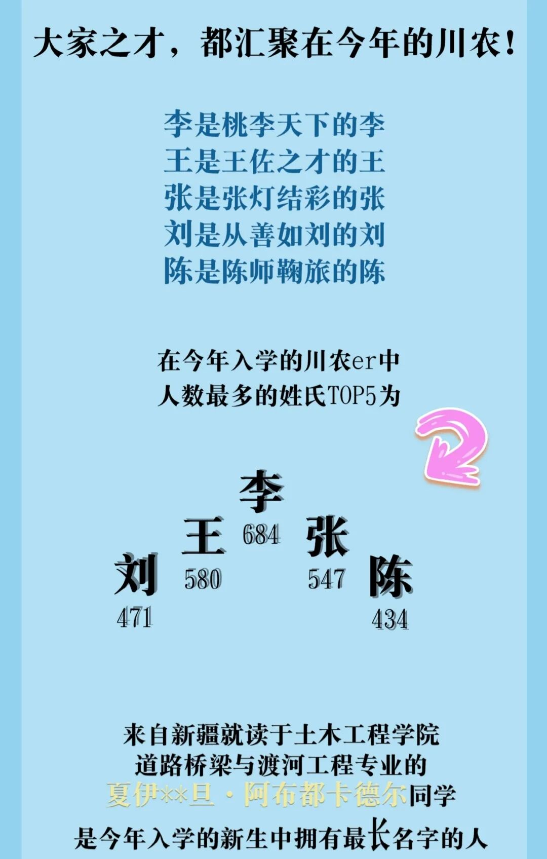 2022级新生有400个姓氏,超100人的姓氏如下: