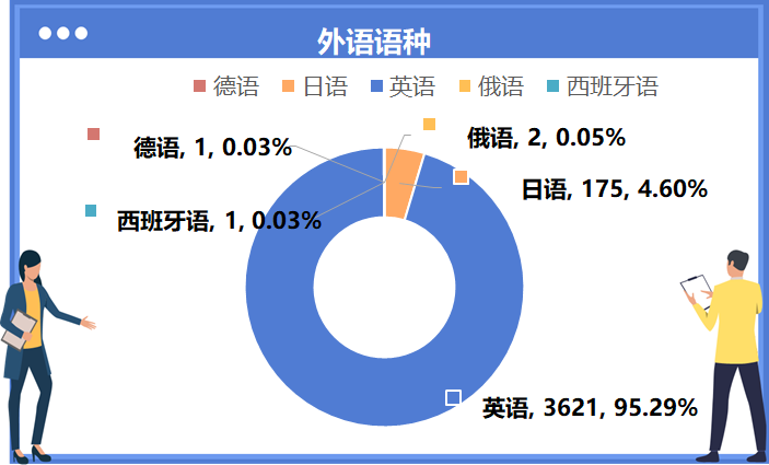 英语3621人、日语175人、俄语2人、德语1人、西班牙语1人。
