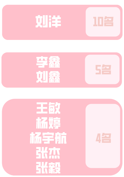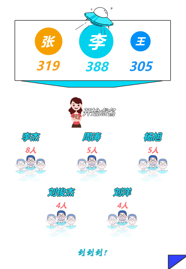 在今年的新生中,重复出现的姓名共248个 。其中,刘洋的名字最受欢迎,已经连续两年位居榜首!(莫非...我们就是失散多年的兄弟?!)
