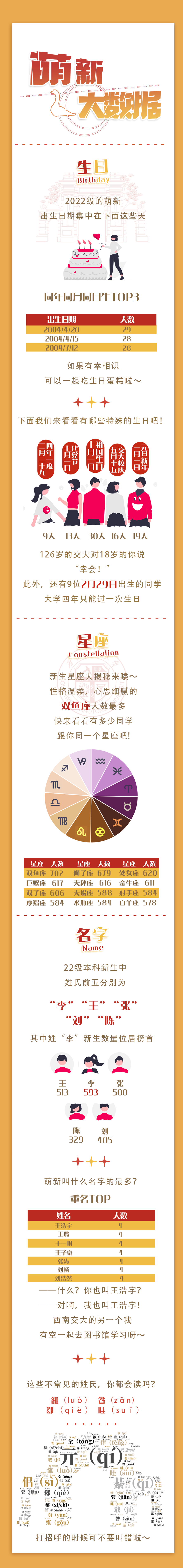 近期,有不少西南高校公布了2022年“萌新大数据”,通过有趣的数据统计,可以让新同学们提早互相了解,小西汇总了目前公布了新生数据的高校,我们一起来看看!