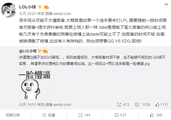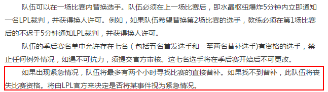 今天的情况实际上不属于紧急情况(mortred在16日就已受伤,doinb被俱乐部自己投诉,也没报入季后赛名单,dade早已被告知不能上场)延长到7点不是因为要找临时替补,而是要让队内符合上场资格的队员Mortred或者peco赶来。