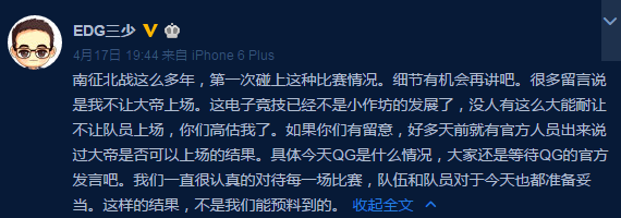 三少有后台,腾讯ceo关系好,故意从中作祟老实说,这事让EDG和三少强行背锅的人,其逻辑能力已经突破银河系。看不出你们这些键盘侠想象力还挺丰富的,问题是三少不认识小马哥啊,他这么有能力,能让队员不上场,我觉得他肯定不会只是一个战队经理,俱乐部合伙人。