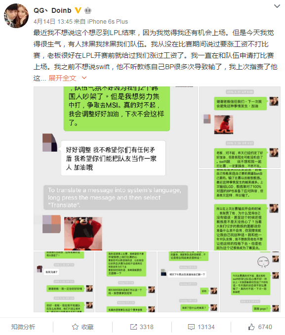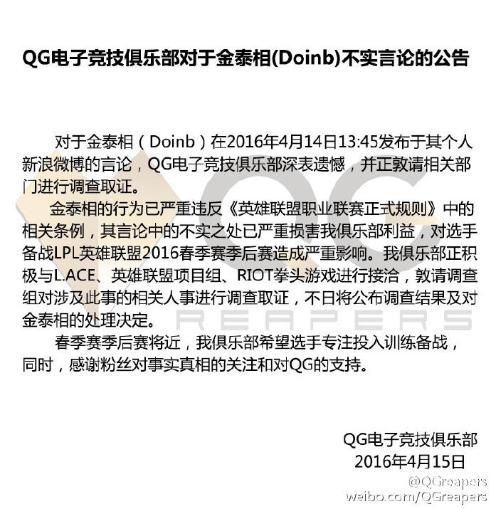 近日,在春季赛常规赛中表现出色的QG战队以及QG的队员们一直处在风口浪尖,舆论不断。而在四月十八号LPL季后赛的半决赛中,QG却未能派出中单选手上场,最终判负。一时间,所有关于QG的猜测充斥着网络,一切疑问都扑朔迷离。万事皆有因,导致QG战队“爆炸”的根源就是常规赛后半段队伍替换掉主力中单Doinb。对于自己沦为替补的解释,Doinb 4月13号发布的一条微博中,矛头直指韩援打野Swift。此后,Swift与Doinb的八卦被玩家广为流传,还戏称QG为又一支“中野恩断义绝”的队伍。微博发布后,QG俱乐部和Swift本人一直没有作出正面回应,直到4月18号QG官方微博发布了一条公告表示Doinb的不实言论损害了俱乐部利益,并且已经请相关部门进行调查取证。