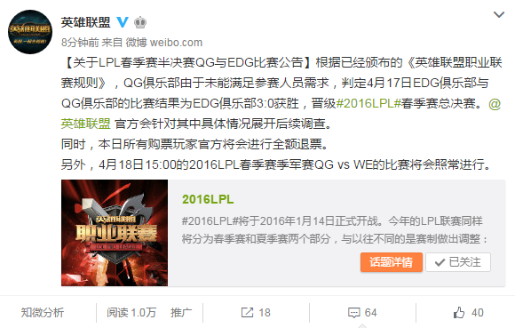 英雄联盟官方公告解读:QG人员不足无法进行比赛,判负,观众全额退票,季军赛如常。