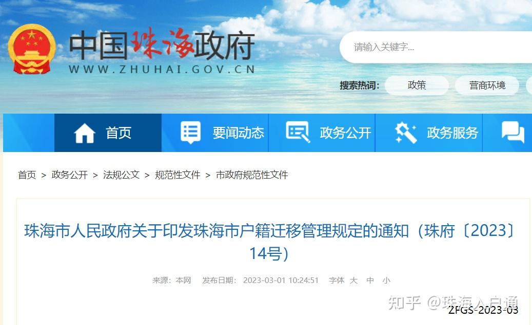 3月1日,珠海市人民政府关于印发珠海市户籍迁移管理规定的通知(珠府〔2023〕14号)。