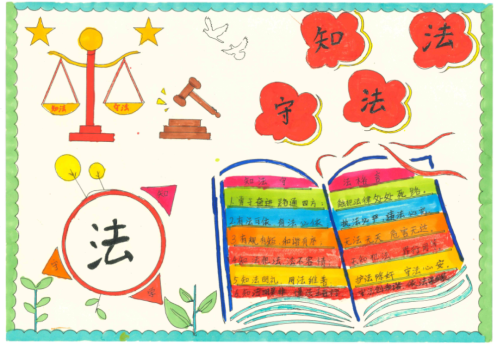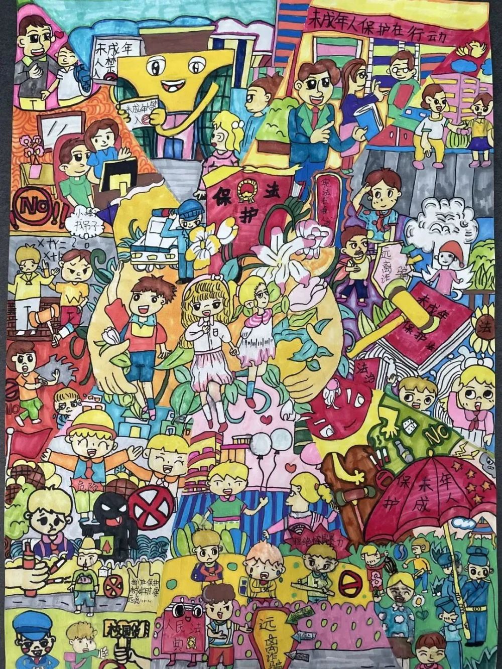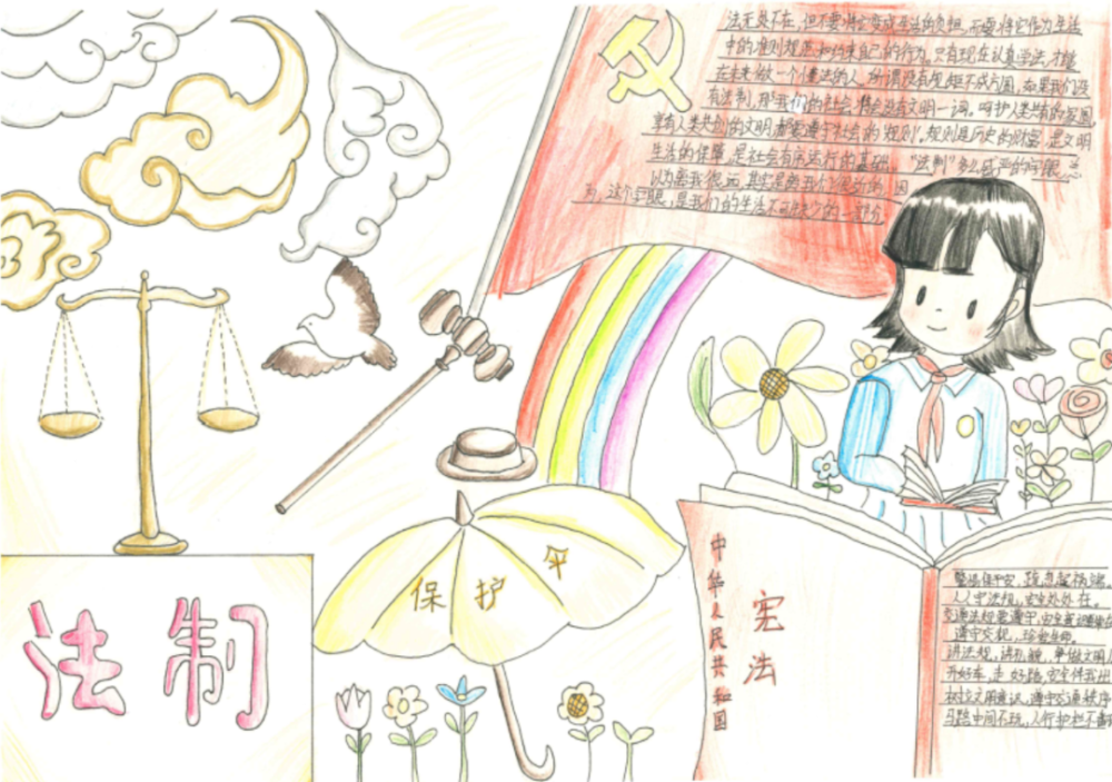 童心绘“宪法”,法治护成长!把宪法放在第一幅,突出主体。通过六个不同的小版块,画出我们心中的宪法小故事。有了法律,我们的秩序更加井然;有了法律,我们的生活更加自由;有了法律,我们迈向幸福生活的脚步会更加坚实。同学们,让我们做一名学法、守法,用法的好少年。