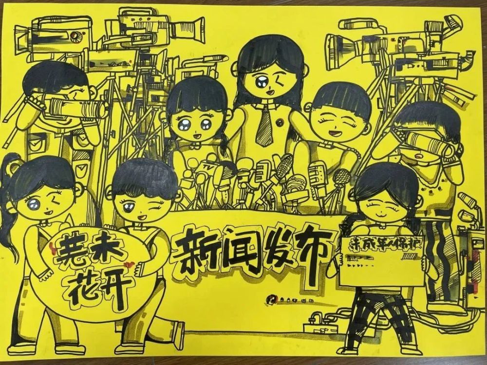 “芜未花开”法治宣讲团是芜湖市检察机关2019年成立的普法宣讲团,宣讲团的检察官姐姐们经常为同学们带来各种类型的普法活动和普法教育,这副作品通过“芜未花开”新闻发布会的场景,展现检察官姐姐们为小朋友带来法律知识,保护未成年人的独特风采。