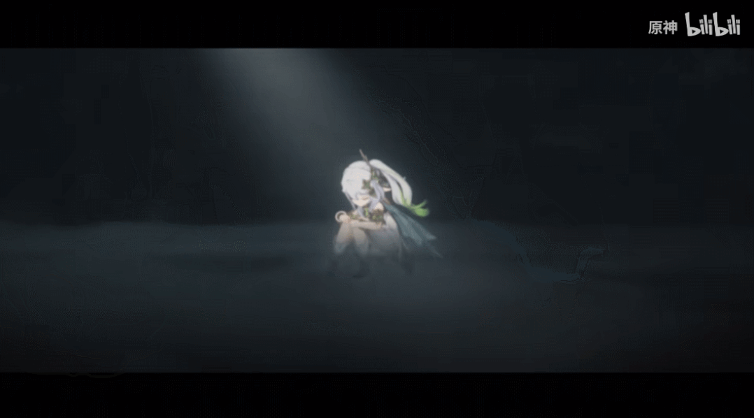 而在视频的结尾,画风一转,兰那罗们都已消失不见,只剩纳西妲独自一人蹲坐在黑暗中。又是强烈的对比烘托出了纳西妲的悲惨境遇,玩家对这个角色的喜爱也在情绪的渲染中更上一层楼。