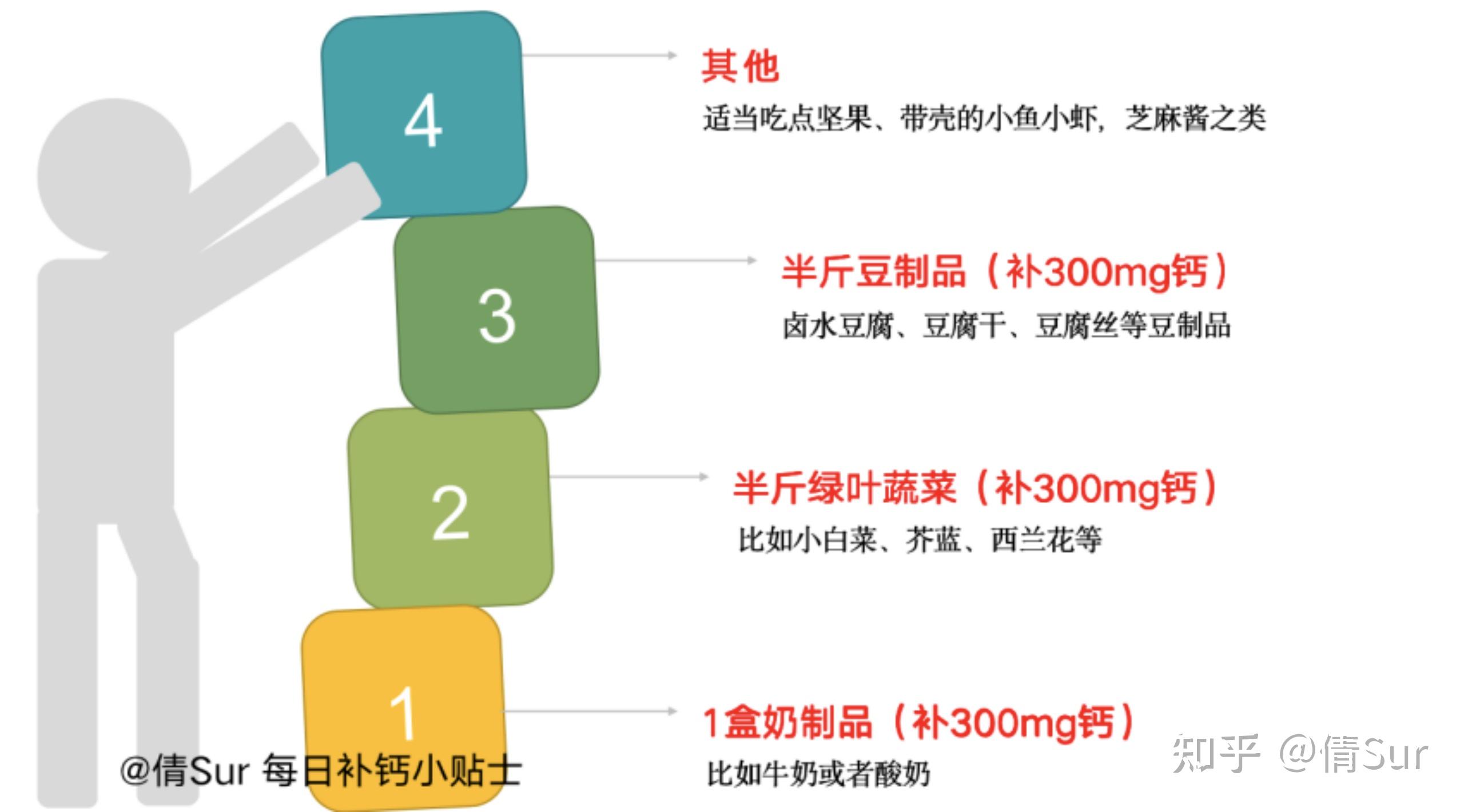 饮食上如何做呢?这里有一个简单的办法:乳制品、豆制品和绿叶蔬菜这3类食物每天一份,就能基本满足我们每天对钙的需求: