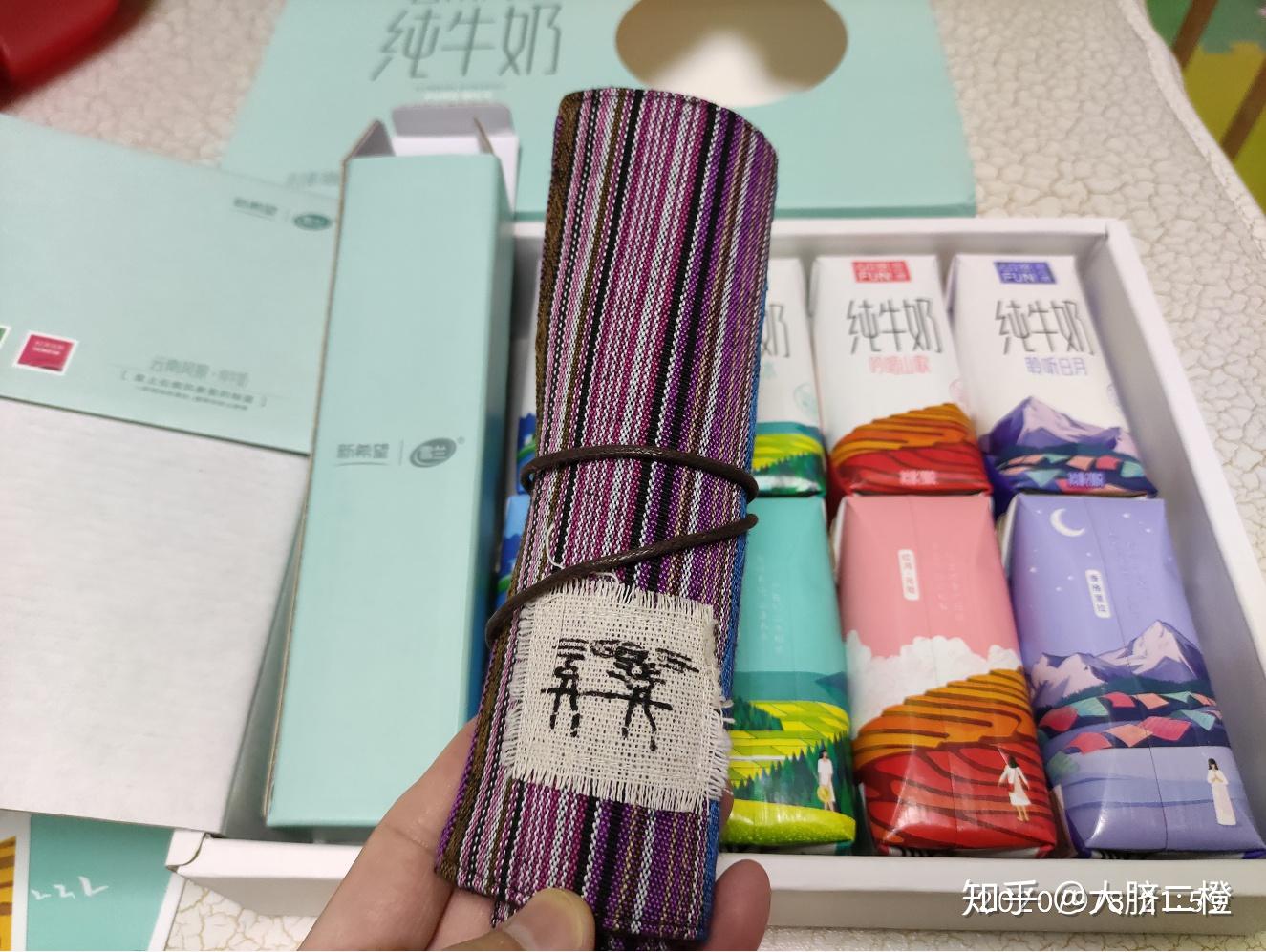 拆开外包装还有新的发现,8盒牛奶竟然是4种不同的包装盒,还都有名字。信封里装了4张明信片,与4种外包装一一对应,旁边的小盒子据说是个盲盒,随机放东西,我买的这箱里是一个装吸管的小布袋子,这个布袋子非常云南。