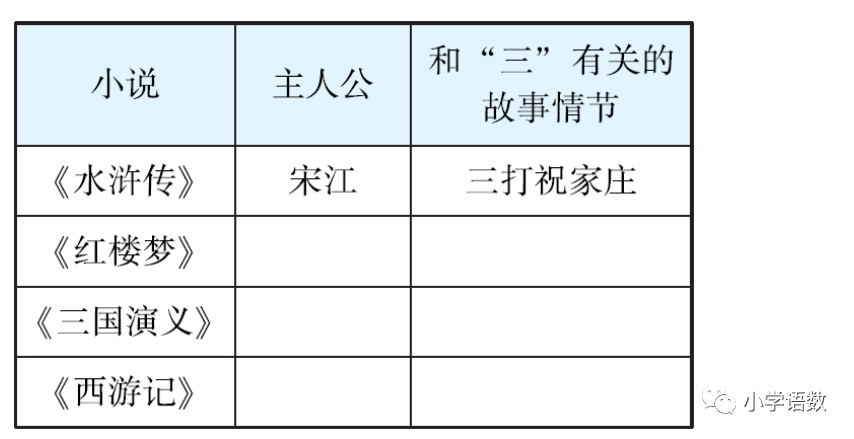 5.中国四大古典名著中巧妙地安排了好多和“三”有关的情节,如武松第三个回合打死了老虎,刘备三顾茅庐请到了诸葛亮。在你读过的这几部小说中还有哪些带“三”的情节呢?照样子填一填。